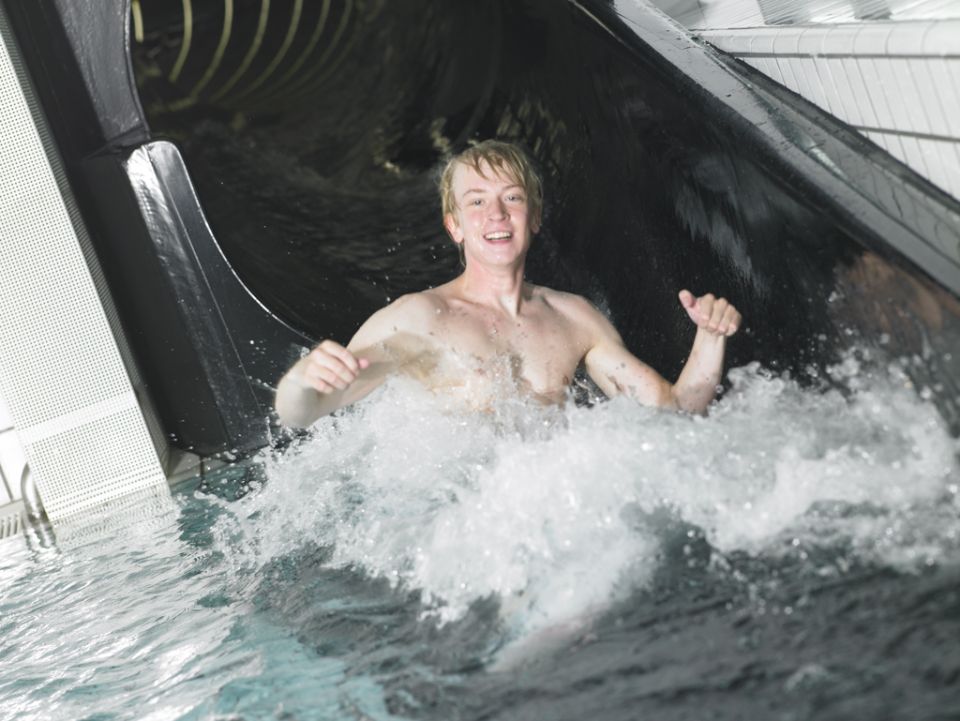 ...darf natürlich nicht fehlen. Mit der Länge von 50 Metern und ihren 4 Kurven bietet die Rutsche rasanten Spaß für Klein und Groß. In ca. 15 Sekunden sausen sie aus einer Höhe von 3,80 Metern in die Tiefe und tauchen schwungvoll ins kühle Nass ein.